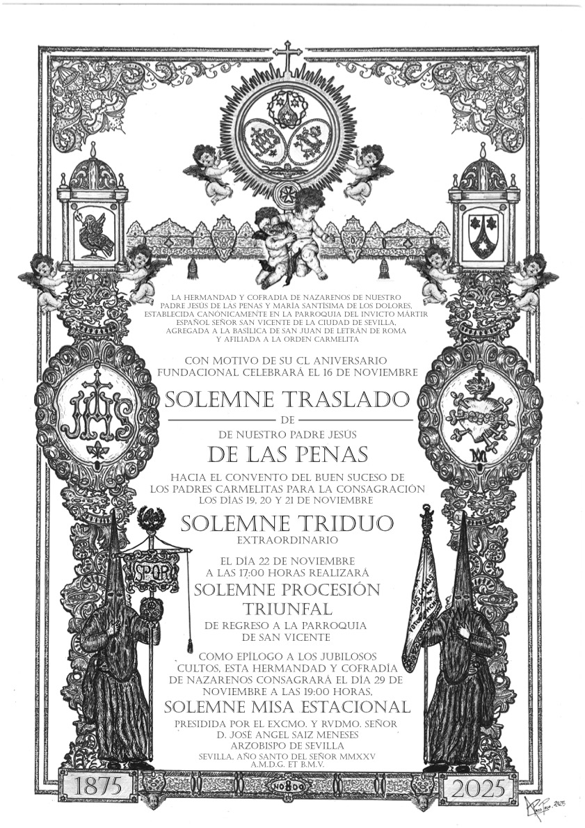 En Sevilla, a 2.025 años de la Encarnación de Nuestro Señor Jesucristo, siendo Sumo Pontífice de la Santa Iglesia Católica Su Santidad León XIV y Arzobispo de nuestra Archidiócesis el Excelentísimo y Reverendísimo Señor Don José Ángel Saiz Meneses, la Hermandad y Cofradía de Nazarenos de Nuestro Padre Jesús de las Penas y María Santísima de los Dolores, establecida canónicamente, desde su fundación en la Parroquia del Invicto Mártir Español San Vicente, agregada a la Basílica de San Juan de Letrán en Roma y afiliada a la Orden Carmelita, con motivo de su 150 Aniversario Fundacional, consagrará para mayor gloria y alabanza de Dios Todopoderoso,